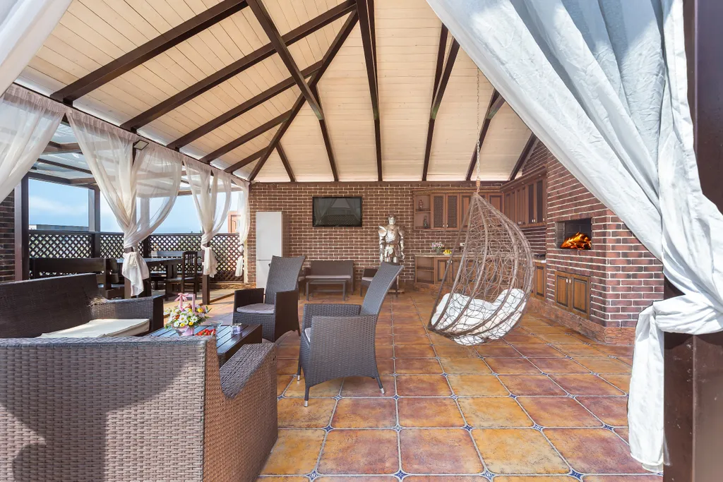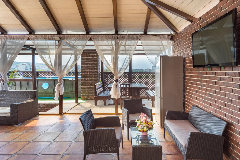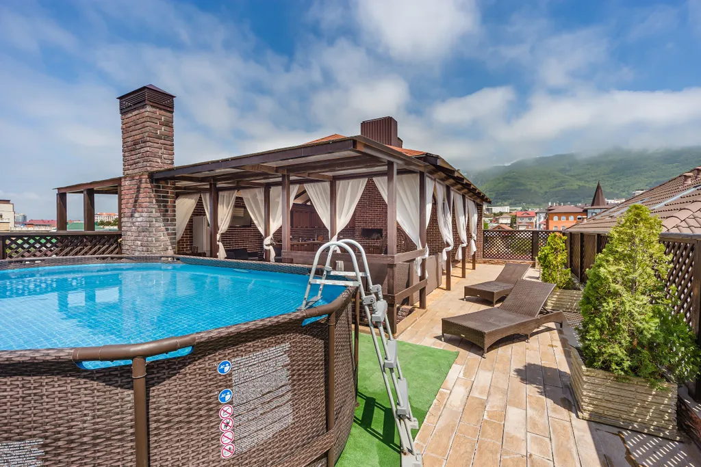 На территории гостевого дома доступны: лаундж зона с бассейном и мангальной зоной, где открывается красивый вид на горы и окрестности геленджика (данная зона может быть арендована полностью под одних гостей по запросу, без общего доступа к ней). Именно поэтому предусмотрена оборудованная зона отдыха на 1 этаже, где есть мангал со всеми необходимыми принадлежностями, общая полностью оборудованная