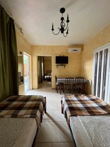 2. Четырёхместный номер, двуспальная кровать + две раздельные или две двуспальные кровати, телевизор, холодильник, кондиционер, 24 кв. М. Разделен на зоны.