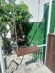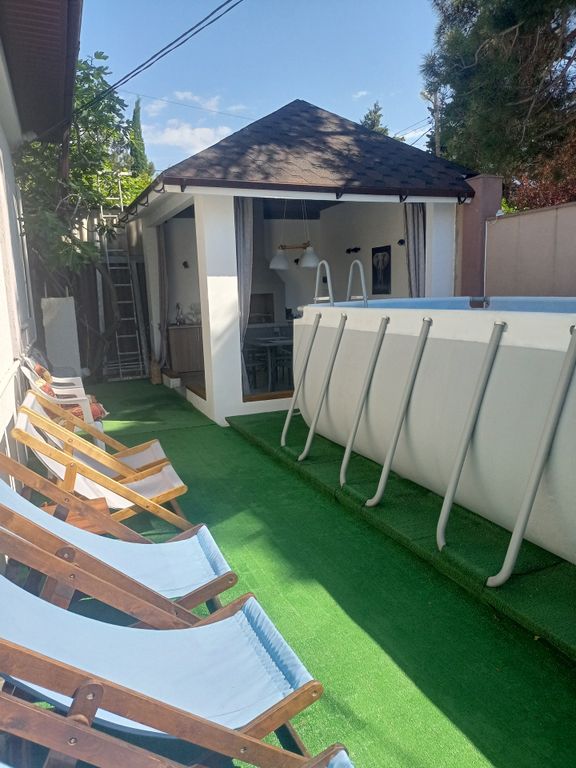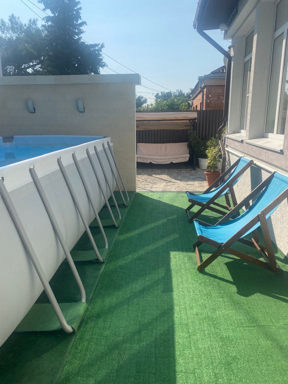 На территории есть зоны отдыха, садовая мебель, садовые качели, мангал, детский батут, каркасный бассейн.
