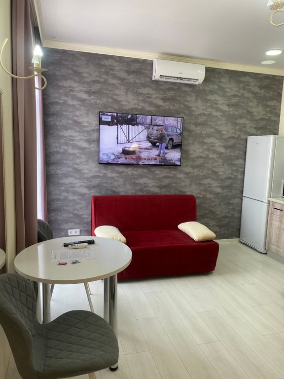 … большая двуспальная кровать, шкаф для одежды, кухня, оборудованная всем необходимым, холодильник, обеденный стол, жк телевизор, кондиционер, санузел (душевая, умывальник, фен), стиральные машины и гладильная доска с утюгом предоставляются бесплатно в хоз. комнате. Смена белья по требованию, уборка за дополнительную плату.