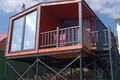 Внутри каждого домика в теремках выполнен стильный и функциональный интерьер, который максимально использует доступное пространство. В гостиной зоне мягкий диван и небольшой обеденный стол, расположенные так, чтобы отдыхать с видом на море. Кухня оборудована всей необходимой техникой: плитой, холодильником, микроволновкой и основной посудой для комфортного приготовления пищи. В спальне стоит удобная кровать с качественным постельным бельём для полноценного отдыха. В домиках также предусмотрена ванная комната с душем и современными сантехническими приборами. Интерьер оформлен в светлых тонах с элементами натурального дерева, чтобы создать атмосферу уюта и гармонии с природой.